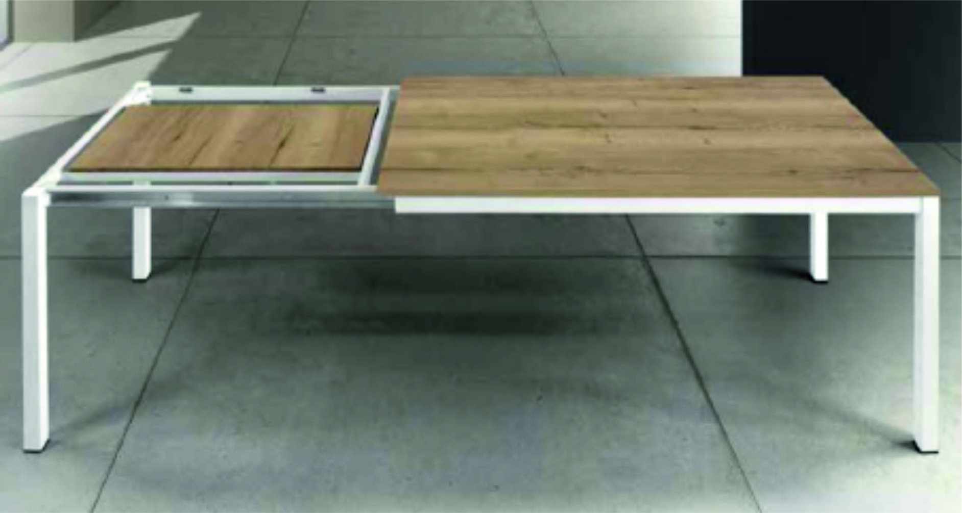 Il tavolo art.949 è composto da 4 gambe quadre metallo verniciato bianco e piano allungo telescopico ,140 x 90 +50 nobilitato rovere rustico.