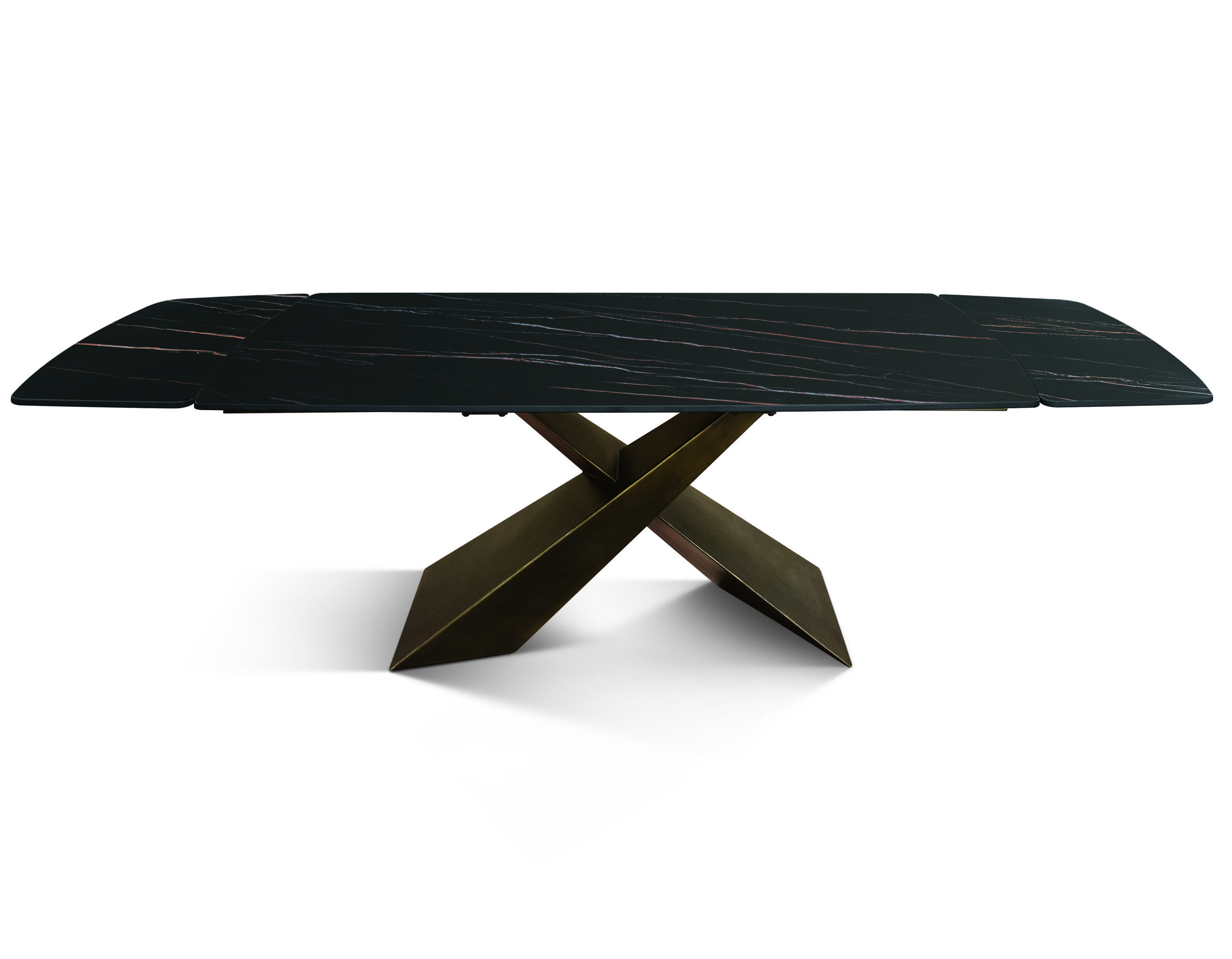 Il tavolo art.955 è composto da basamento incrociato metallo colore bronzo e piano arrotondato ceramica finitura golden nero, 160 x 90 h.78 allungabile ai lati 2 allunghe da 40
